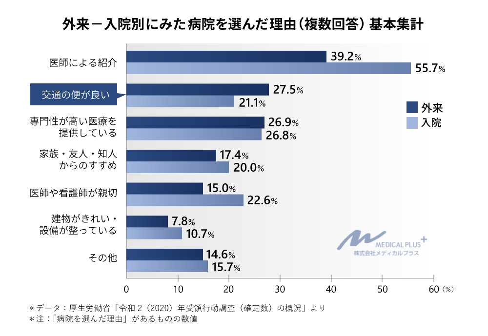 ここで一つデータをご紹介いたします。厚生労働省の「令和2(2020)年 受療行動調査」(PDF)では、外来・入院を問わず「交通の便が良い」が病院を選ぶ理由の上位に挙げられています。クリニックではなく病院を対象とした調査ですが、医療機関として同様の意味合いと捉え十分に参考となるデータで、この傾向は、2025年現在も変わっていないと感じます。この「交通の便が良い」という回答の背景には、ネット社会となった今では単なる距離の近さだけでなく、「見つけやすい」、「印象が良い」、「安心して行ける」といった心理的要素が含まれていると考えられます。