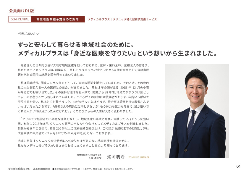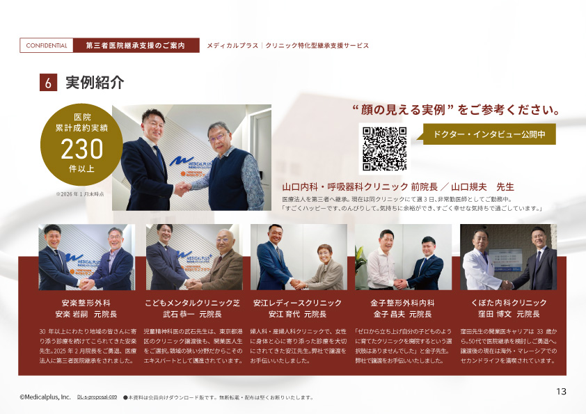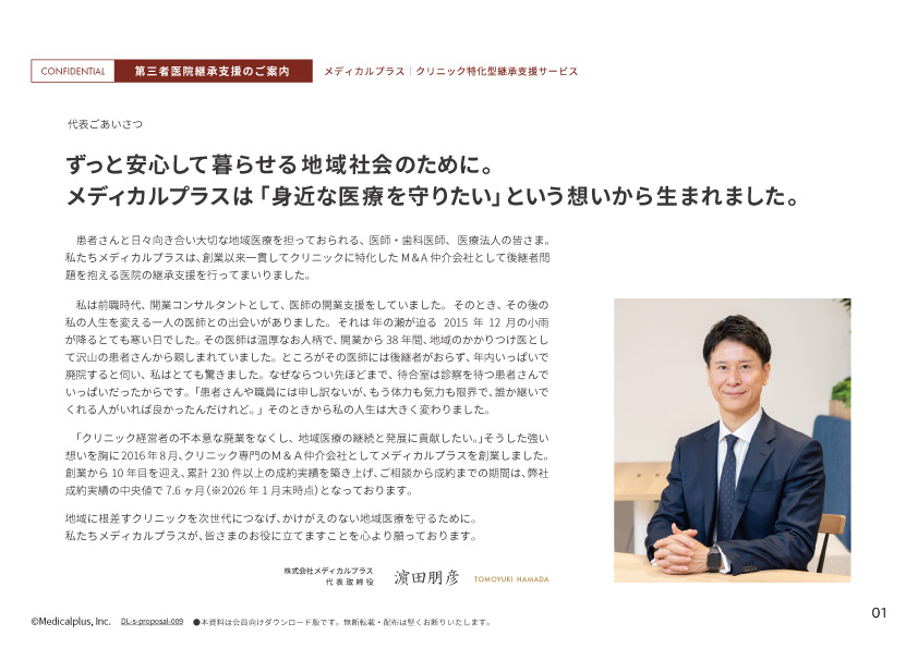 本資料は、ご勇退や譲渡を視野に入れて情報収集を始めたいとお考えの開業医の先生に向けて、当社支援サービスの概要をまとめたご案内資料です。