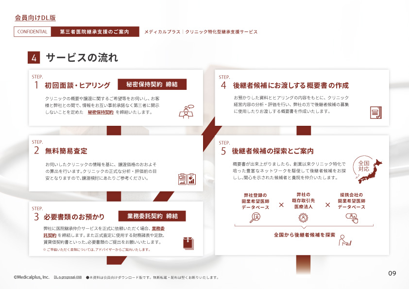 第三者医院継承で譲渡をご検討中の先生に向けた、 弊社支援サービスの概要資料です。