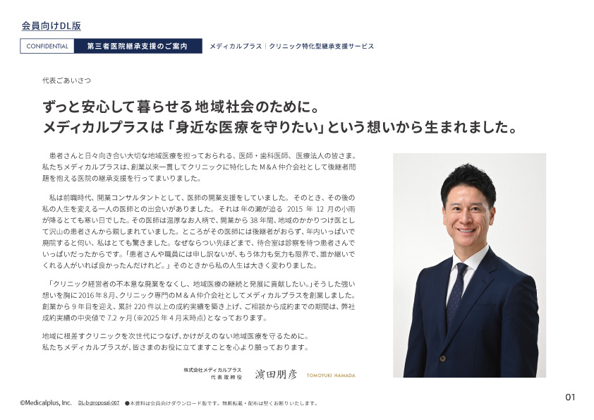 初期費用を抑えながらも、地域に根ざした診療体制を受け継いでスタートできる「継承開業」は、今後の開業スタイルの選択肢として、ますます注目が高まっています。本資料では、メディカルプラスが提供する第三者医院継承支援サービスの特徴や進め方、買主様から多くご相談いただくポイントなどを簡潔にまとめました。