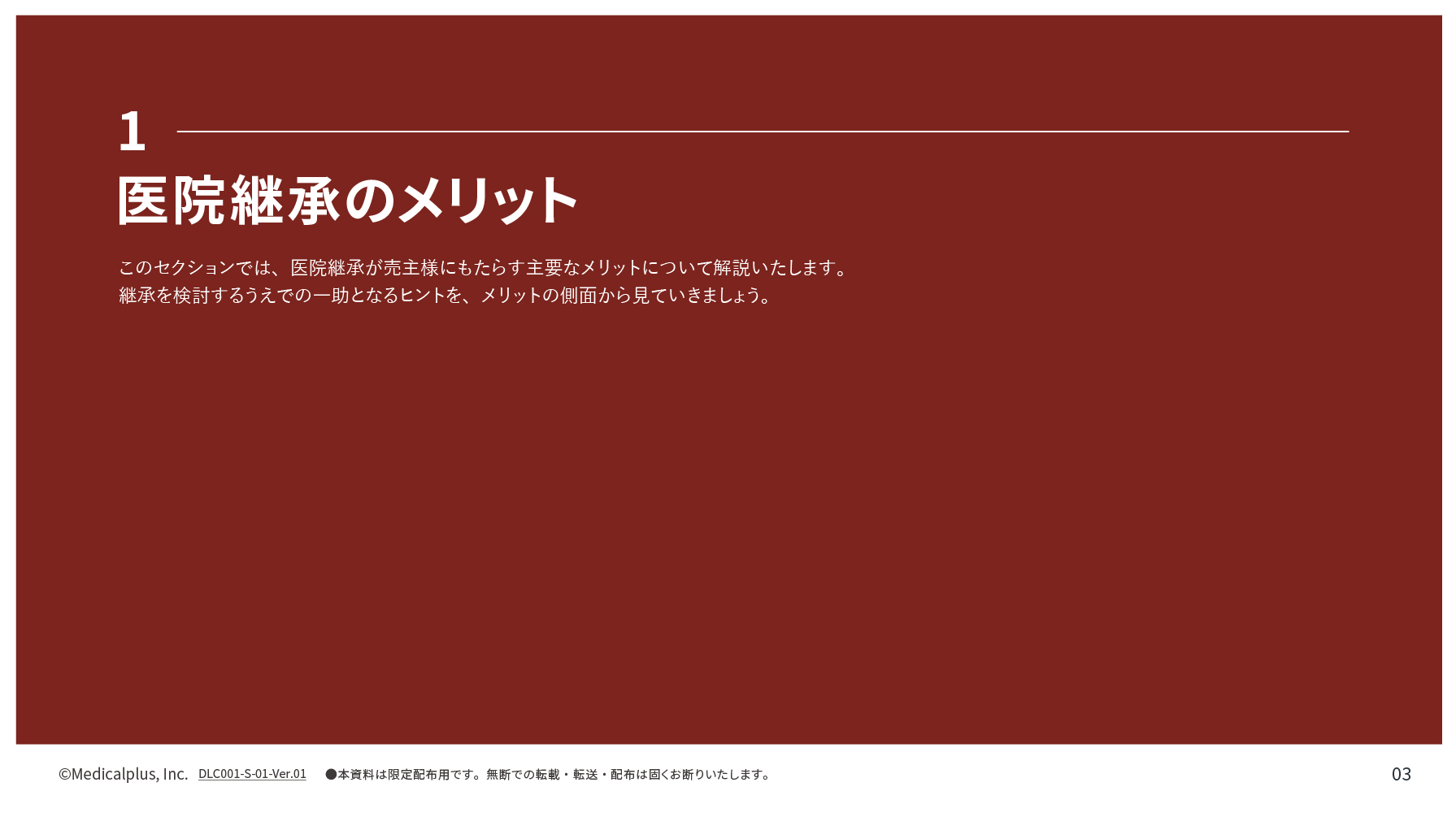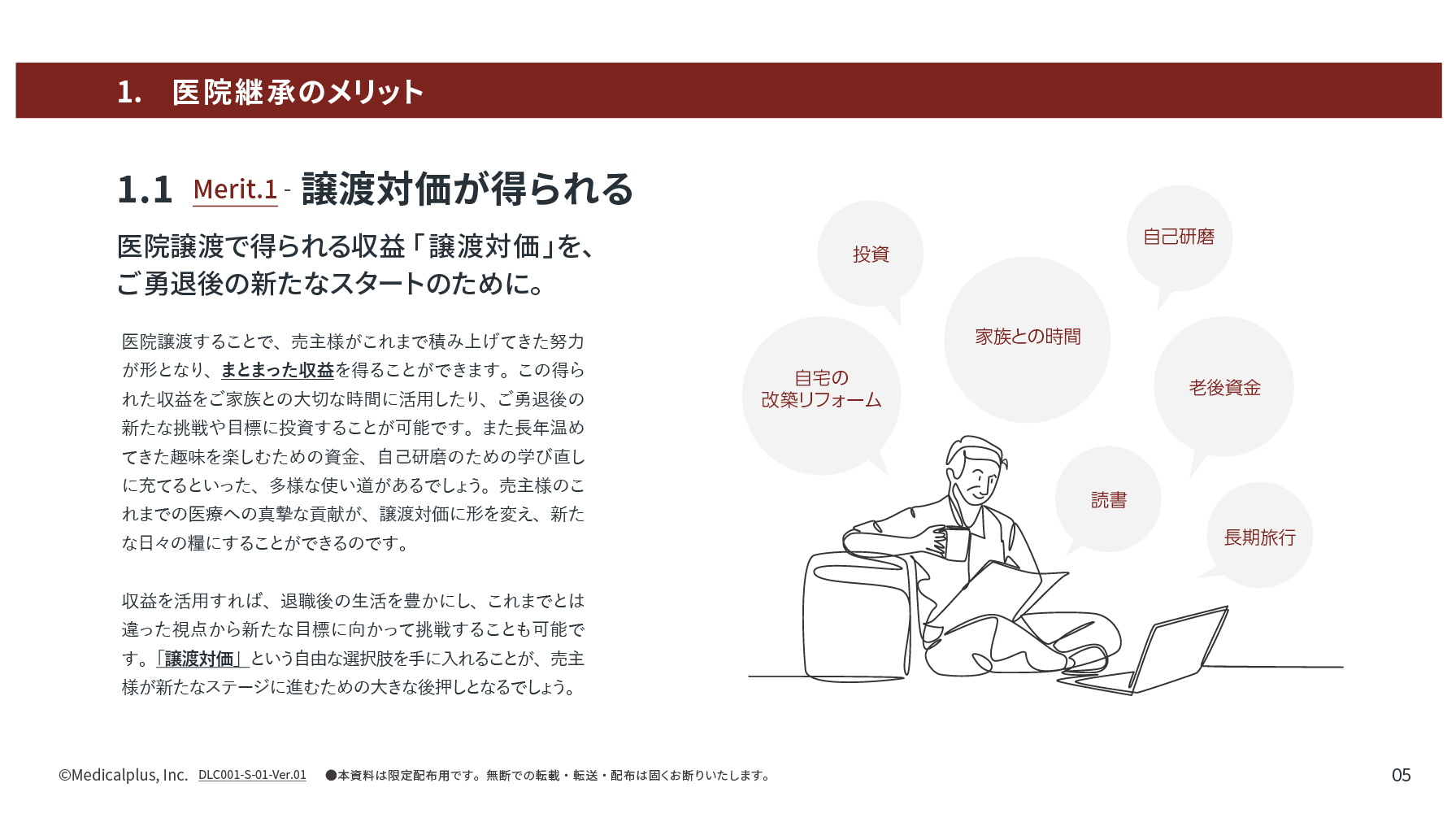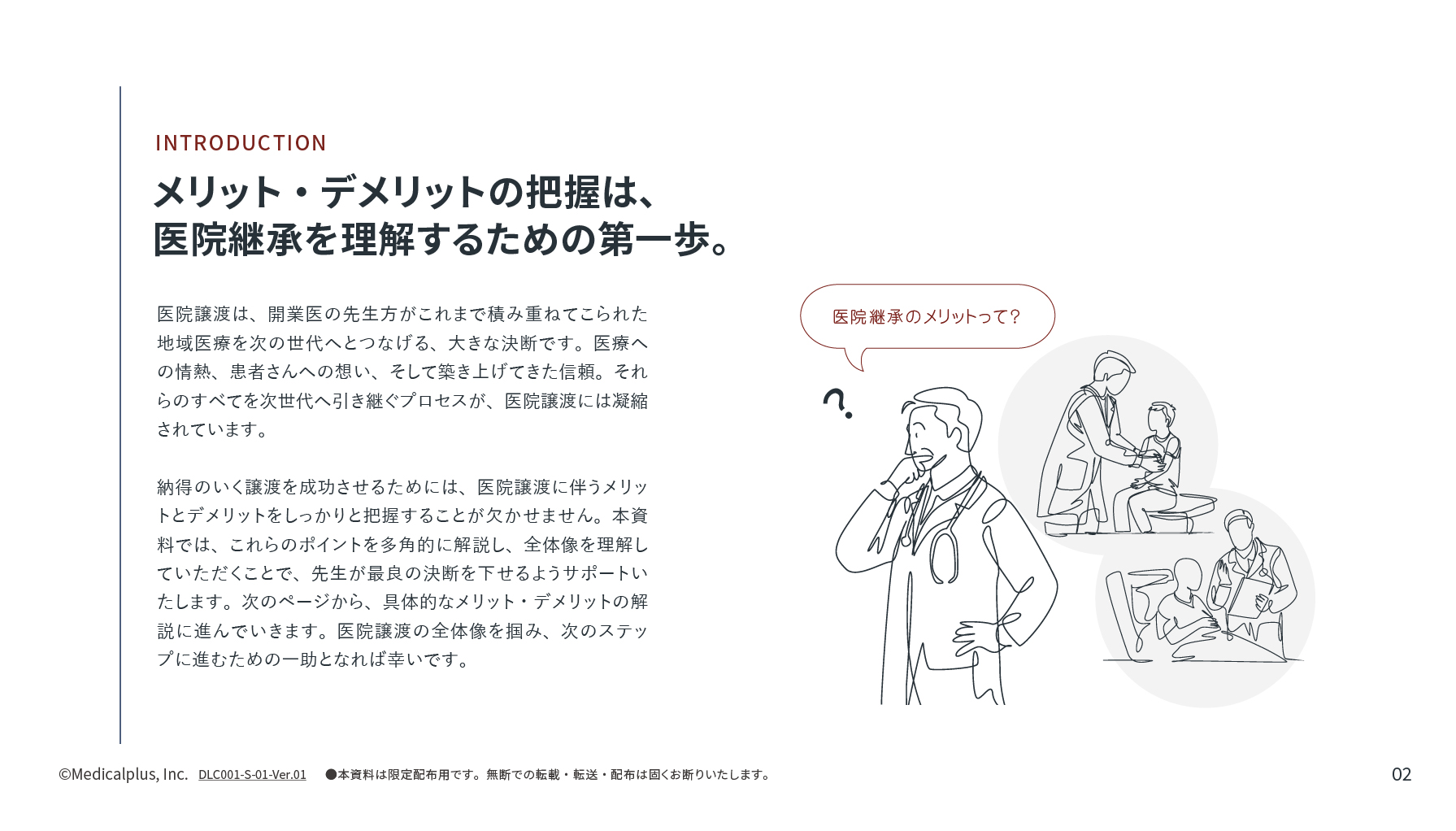 本資料は、ご勇退や譲渡を検討しはじめた先生方に向けて、医院を第三者に継承する際の「メリット」と「デメリット」をわかりやすく整理した内容です。まず全体像を理解したい、イメージしたいという先生にも読みやすい構成として、編集いたしました。今すぐ具体的な計画がなくても、今後を考える一助としてお役立ていただけますと幸いです。